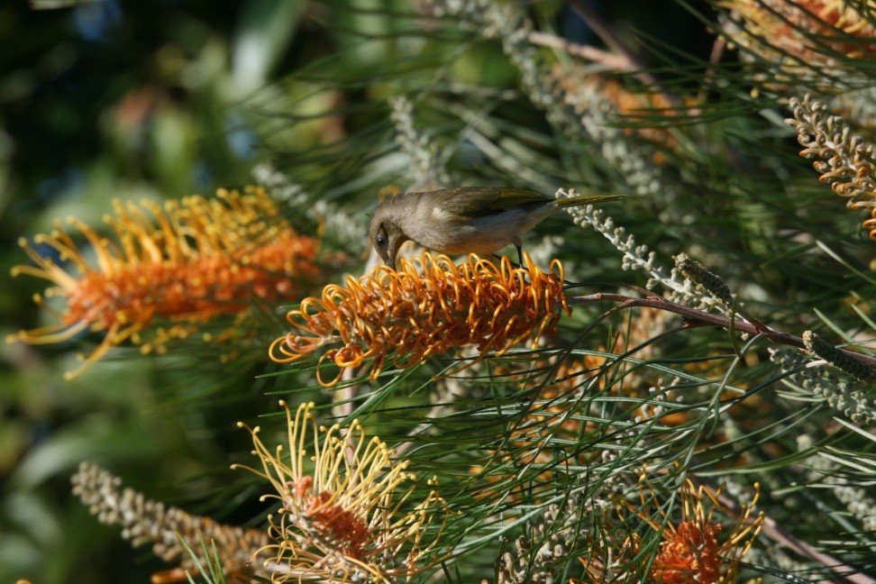 A brown honeyeater feeds among vivid orange banksia flower spikes, partially hidden by fine needle-like foliage as it probes the blooms for nectar in open woodland.